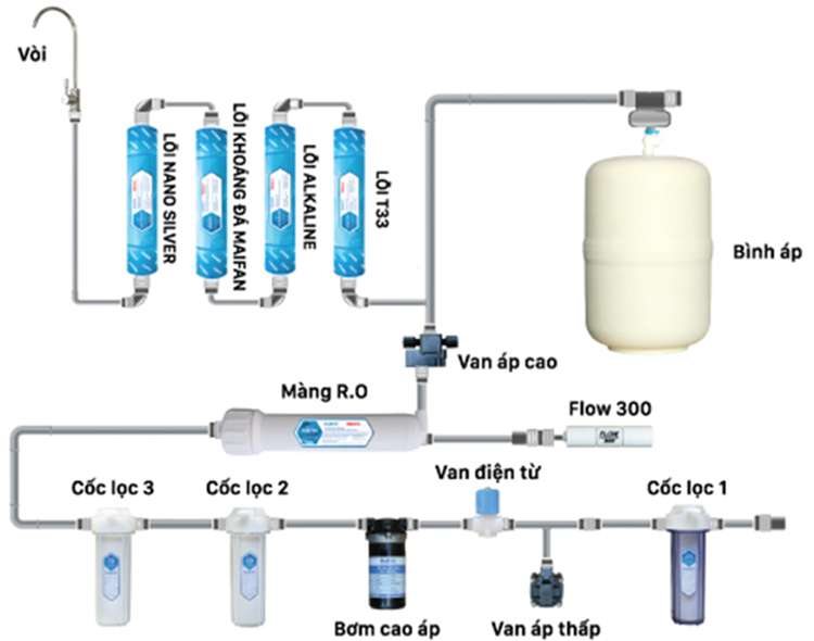 Nước sau khi đi qua các cốc lọc đã được loại bỏ các chất độc hại, thêm vào các khoáng chất có lợi cho sức khỏe sẽ được đưa lên vòi cho người dùng sử dụng uống trực tiếp mà không cần đun sôi.