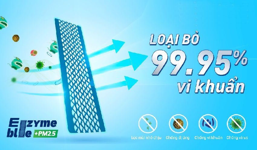 Phin lọc Enzyme Blue như một lá chắn bảo vệ, đưa ra một giải pháp tối ưu nhằm mang lại bầu không khí trong lành cho nhà bạn giúp giảm khả năng lây nhiễm vi rút xuống dưới 1:1000. Enzyme Blue có khả năng giảm 99,9% một số loại vi khuẩn (Staphylococcus aureus, Escherichia coli (E.coli), Klebsiella pneumonia…) và loại bỏ hơn 90% các mùi hôi trong vòng 1 giờ.