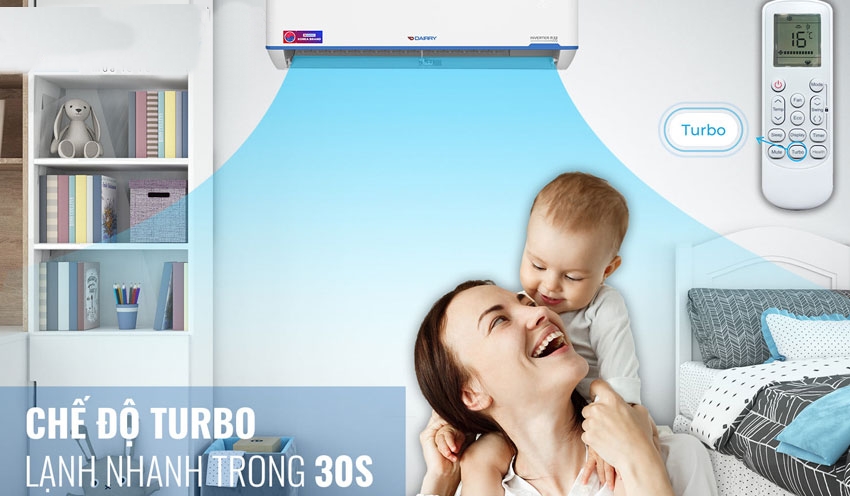 Điều hòa Dairry 1 chiều 12000btu I-DR12UVC này được tích hợp chế độ Turbo giúp làm lạnh nhanh trong 30 giây ngay sau khi khởi động máy. Với chế độ này, người dùng sẽ được trải nghiệm làn gió trong lành mát lạnh với tốc độ siêu nhanh mà không cần phải chờ đợi lâu.