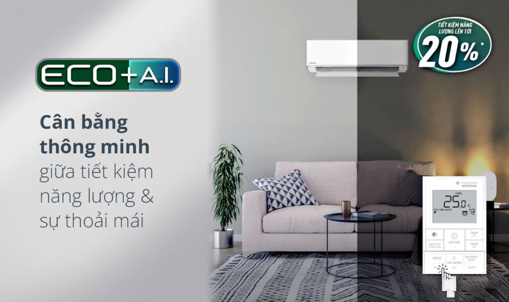 Chế độ Eco với công nghệ Artificial Intelligence – Trí tuệ nhân tạo AI có khả năng kiểm soát nhận biết về môi trường trong phòng giúp tiết kiệm năng lượng tối ưu, tự động điều chỉnh về mức Eco dựa trên điều kiện tải nhiệt và công suất điều hòa.