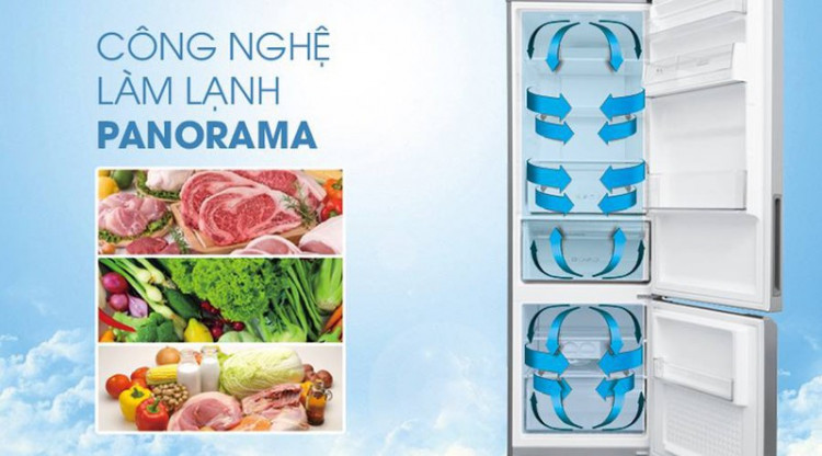 Được trang bị công nghệ hệ thống khí lạnh đa chiều Panorama, tủ lạnh giúp hơi lạnh lan tỏa đều đến mọi ngóc ngách bên trong ngăn chứa, giúp thực phẩm được làm lạnh đồng đều một cách tối ưu nhất, ngay cả ở những nơi ngóc ngách, ngăn chặn nguy cơ thực phẩm bị hư hỏng hay biến chất.